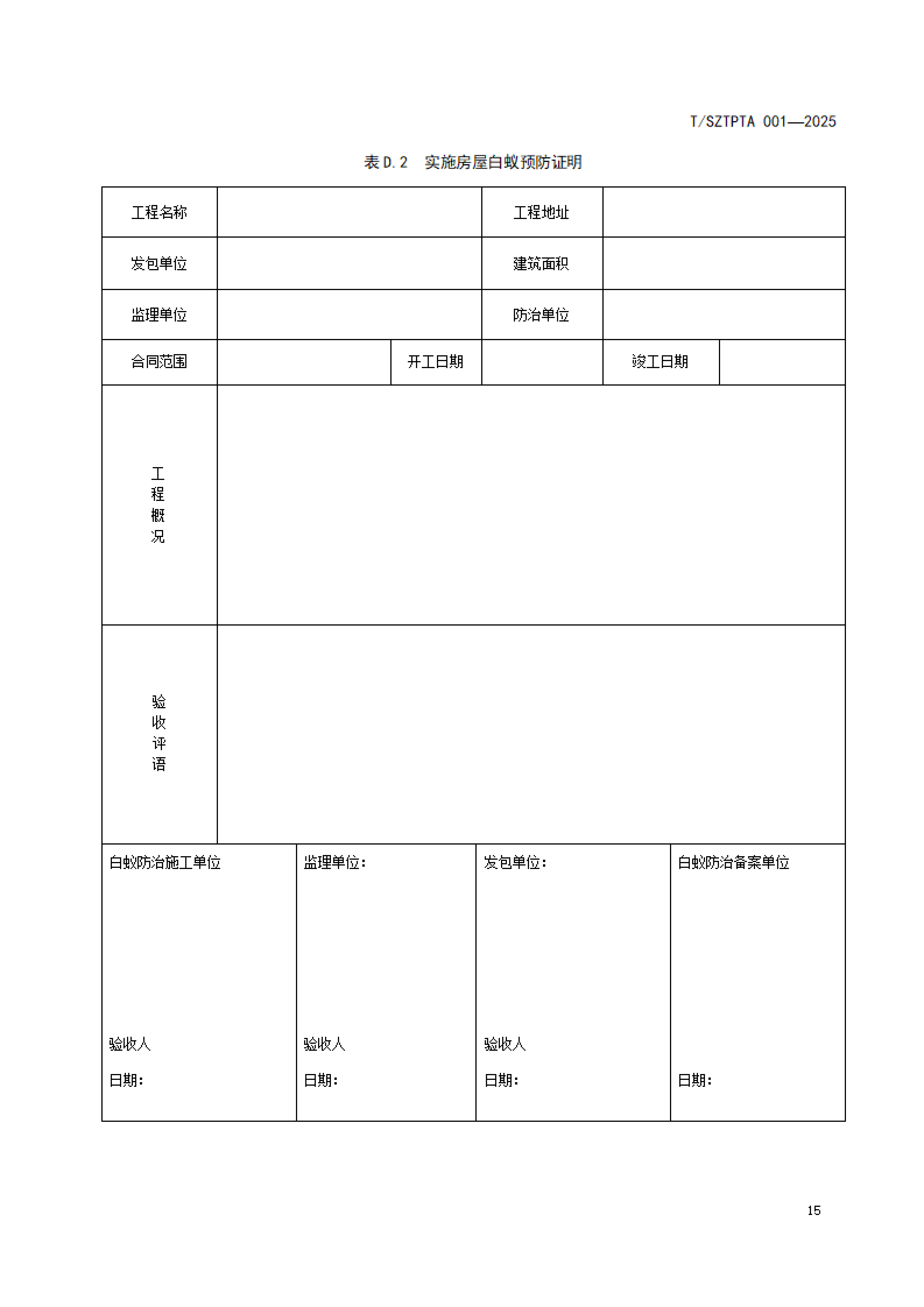 9.6 白蚁预防工程验收合格后,应向深圳市白蚁防治行业协会提交竣工验收备案资料,并取得《实施房屋白蚁预防证明》。