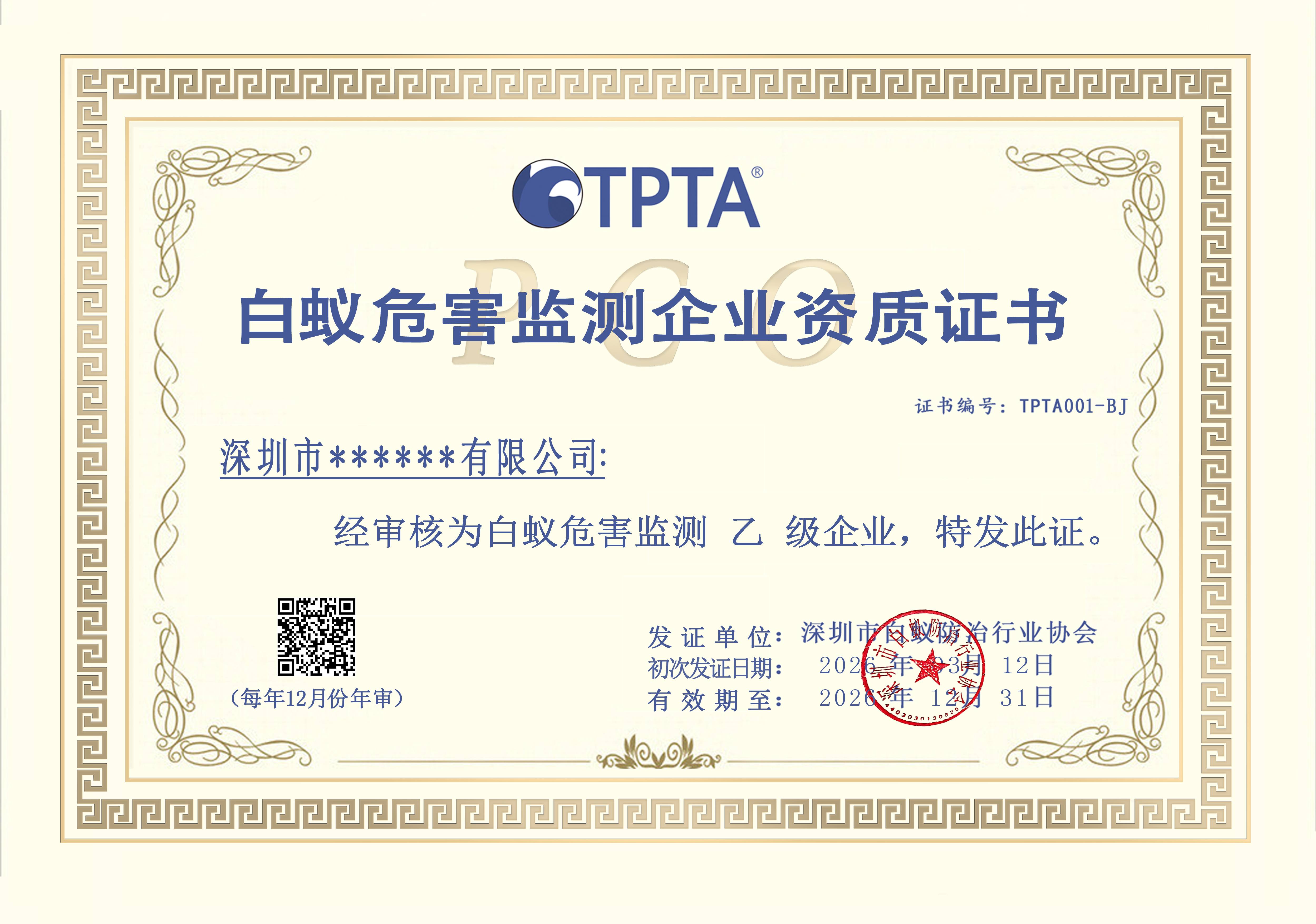 1、获得深圳市白蚁防治行业协会颁发的《白蚁危害监测企业资质证书》(乙级)一年及以上。