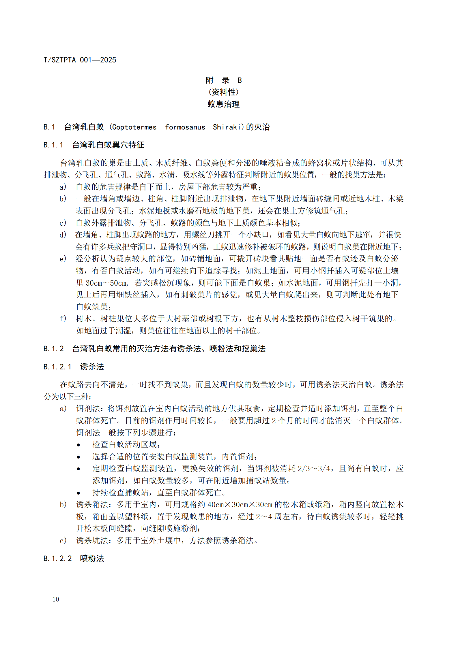 10.4 在复查过程中如发现白蚁为害,应对相同及相邻楼层的所有范围进行细致的检查,对白蚁进行采样并鉴定白蚁种类,然后根据不同的白蚁种类,参照附录B选择适当的方法进行处理。